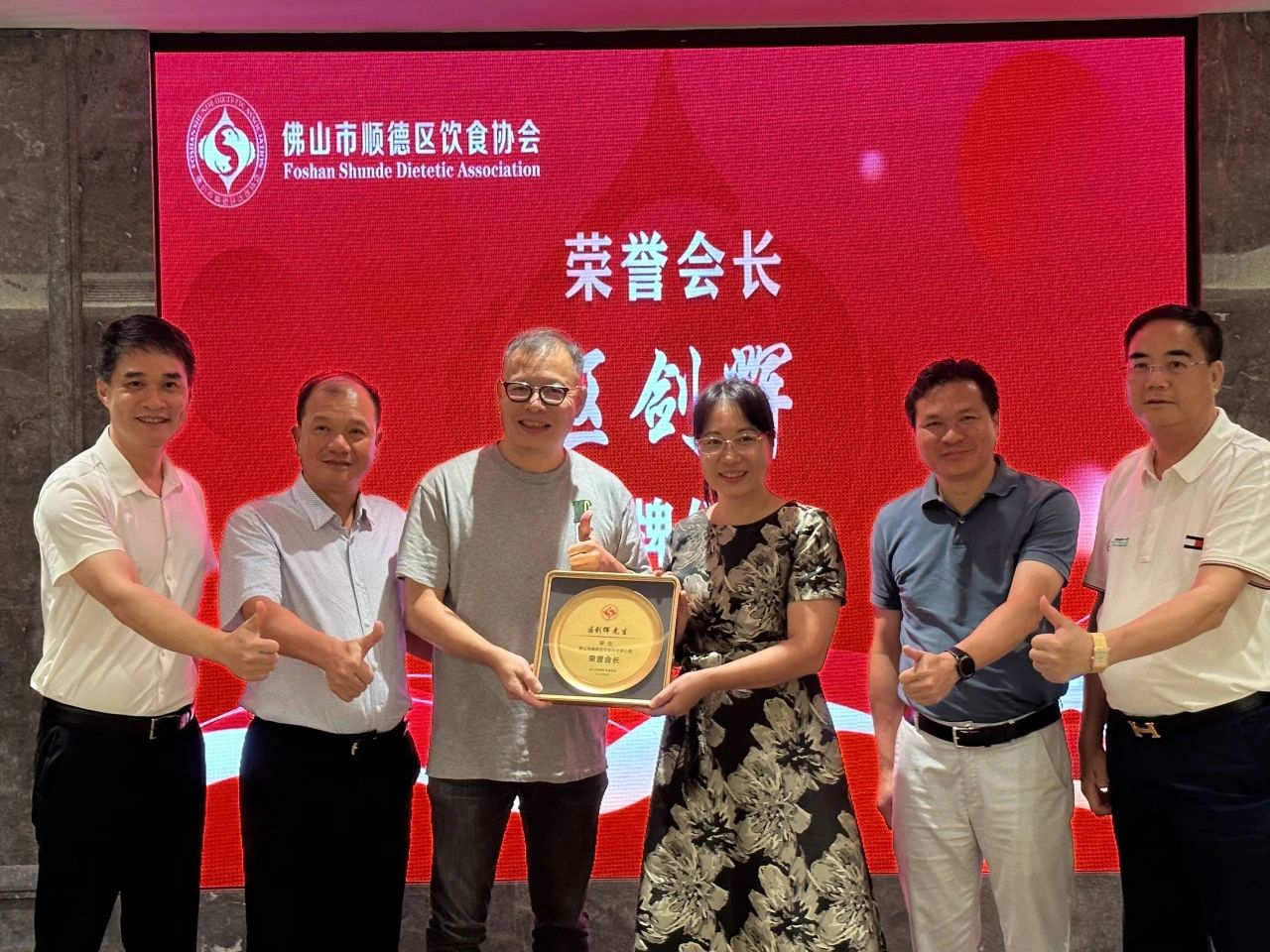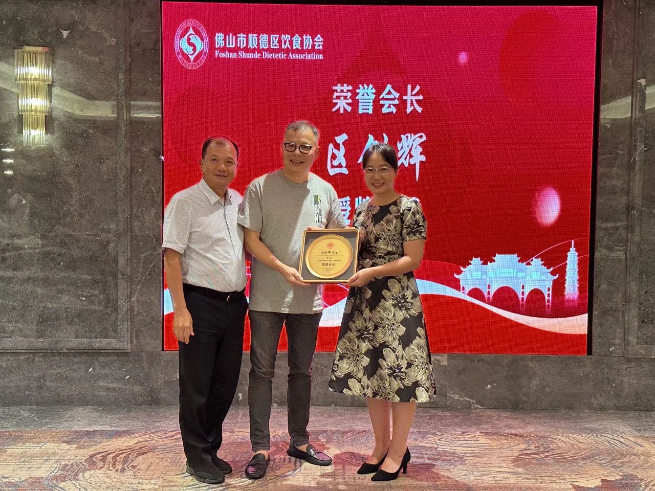 顺德区委统战部副部长、区工商联党组书记朱艺婷为上海逸荟餐饮集团董事长兼创始人区剑辉先生颁发“荣誉会长”牌匾。