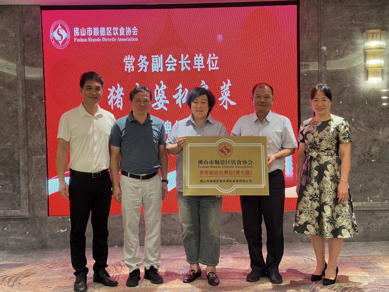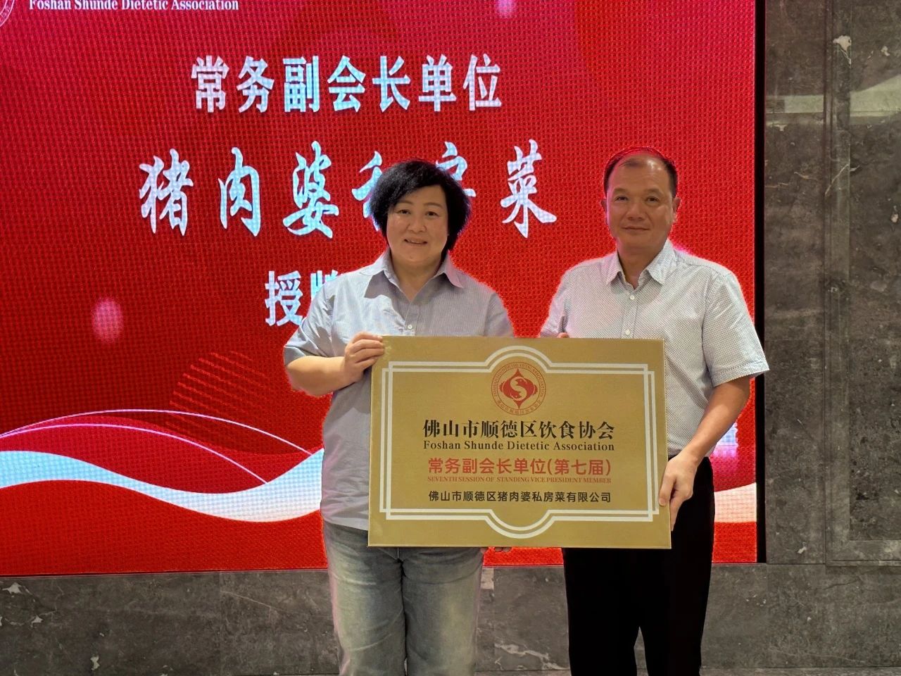 顺德区饮食协会会长卢远森向猪肉婆私房菜品牌创始人、广东天悦餐饮管理集团董事长吴素芬授牌,佛山市顺德区猪肉婆私房菜有限公司正式成为顺德区饮食协会常务副会长单位。